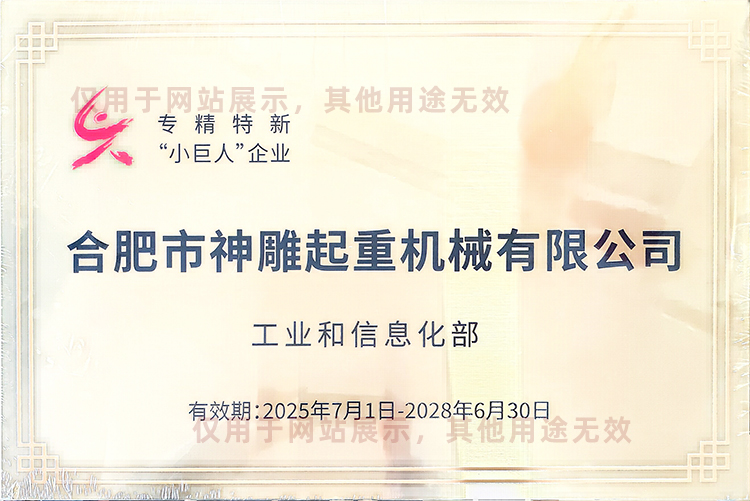 合肥神雕起重是高新技術企業,是安徽省科創板掛牌企業(證券代碼:630331),同時榮獲安徽市場質量、誠信五星級企業、合肥經濟圈示范企業、合肥市創新型企業、安徽省市場質量放心產品等榮譽稱號